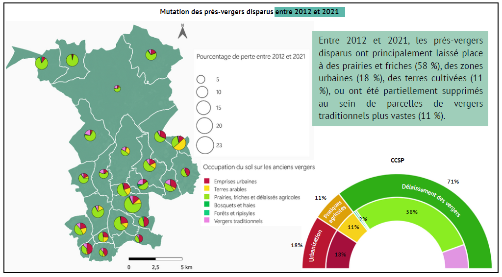 Grâce aux photos aériennes accessibles via la démarche DataGrandEst, elle identifie et cartographie ces espaces en traçant les arbres fruitiers alignés et en appliquant un tampon de 6 mètres pour estimer leur surface. En 2021, 476 hectares de prés-vergers ont été recensés, mais l’analyse révèle une perte de 41 % de ces surfaces depuis 1950. L’utilisation de la base de données d’occupation du sol Grand Est a permis de caractériser les mutation, principalement due à l’urbanisation, aux changements de pratiques agricoles et au délaissement. Cette approche innovante permet d’adapter les politiques locales pour mieux protéger ces milieux riches en biodiversité.