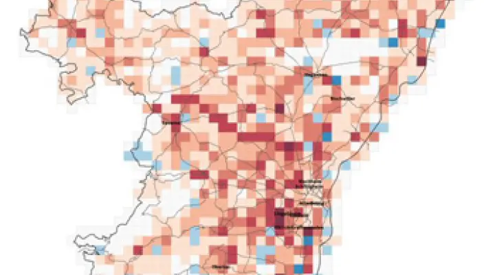 Julien Guérard a eu l’idée de recourir aux données OCS du Bas-Rhin disponibles pour 2010 et 2018 sur DataGrandEst et de montrer la progression de l’artificialisation du sol pendant cette période de temps. Il est plus difficile visuellement de comparer deux cartes et d’y voir les changements. Avec ce type de visualisation (petits carreaux représentants une zone de 2km sur 2km), Julien Guérard nous aide à mieux voir si notre territoire a subi de gros changements au cours de la dernière décennie : plus le carré tire vers le rouge, plus l’espace a été artificialisé.